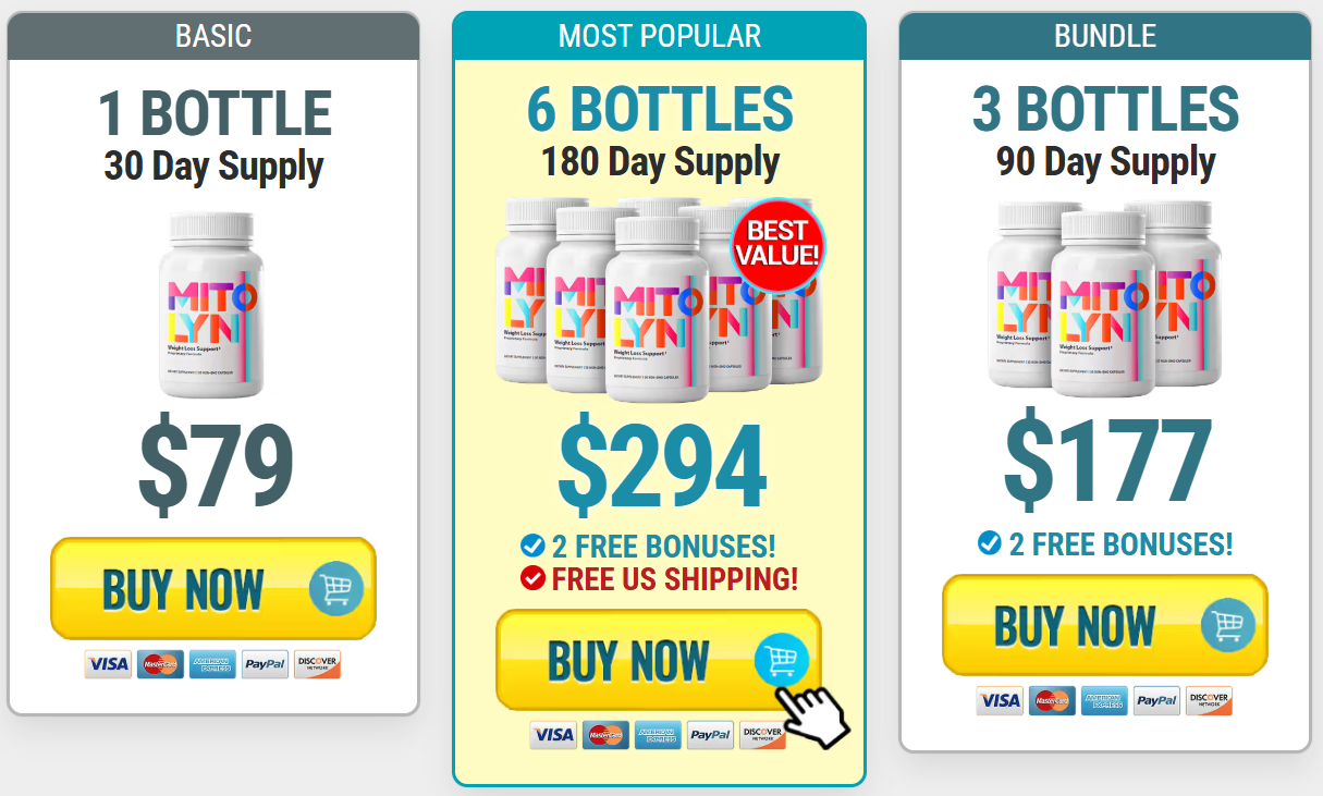 The Most Popular option, six bottles for $294, also offers free shipping and two bonus gifts, enhancing your Mitolyn experience.